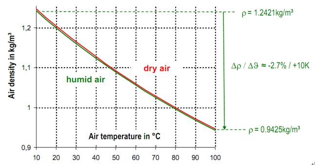 - 环境温度每升高10K,空气密度下降7% ,在工程上已经不能忽略,因为环境温度升高35 度就会产生空气密度10% 的降低。