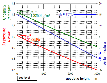- 海拔每升高1000m,空气密度降低1kg/m^3,约为10%。